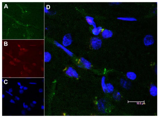 Confocal microscopy images of the parietal cortex of animals submitted to tMCAO after 2 h of reperfusion. (A): Cy2 green fluorescence represents NGB. (B): Rhodamine red fluorescence detects NPs. (C): DAPI blue fluorescence marks cell nuclei. Images are representative microphotographs of samples from 8 experimental animals. (D): Merge of images of (A–C). Scale bar: 10 μm.