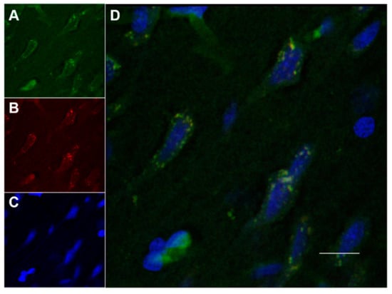 Confocal microscopy images of the parietal cortex of animals submitted to tMCAO after 24 h of reperfusion. (A): Cy2 green fluorescence represents NGB. (B): Rhodamine red fluorescence detects NPs. (C): DAPI blue fluorescence marks cell nuclei. Images are representative microphotographs of samples from 8 experimental animals. (D): Merge of images of (A–C). Scale bar: 10 μm.