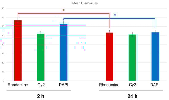 Figure 11 shows the quantification (grey mean values) of Cy2 (NGB), rhodamine (NPs), and DAPI (nuclei) fluorescence in the cerebral parenchyma 2 h and 24 h after the onset of reperfusion, using the Leica advanced software AF (Leica Microsystems, Wetzlar, Germany). This software allows quantify the fluorescence of a determined fluorophore in the microscopic visual field of the histological section selected. The data showed that rhodamine slightly decreased (p < 0.05) after 24 h of reperfusion, while NGB remained stable. After 24 h, some rhodamine fluorescence could have been lost; however, as NGB was marked by immunohistochemistry, it was not be severely affected as time elapsed since the NGB–NPs were injected at the onset of the reperfusion. The same result obtained for rhodamine was observed in relation to DAPI, although in this case it could be also related to the changes induced by reperfusion in the infarcted tissue.