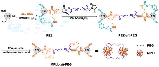 MPLL-alt-PEG copolymers were synthesized in a successive procedure of PEI initiated polymerization of ε-benzyloxycarbonyl-l-lysine N-carboxyanhydride (ZLL-NCA) to prepare PEI-grafted poly(ε-benzyloxycarbonyl-l-lysine) (PEZ), followed by the peripheral crosslinking with difunctional SCM-PEG-SCM, and the subsequent removal of the benzyloxycarbonyl side chain protecting groups (Figure 1).