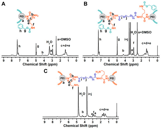 1H NMR spectrum of PEZ in DMSO-d6 (A), PEZ-alt-PEG in DMSO-d6 (B), and MPLL-alt-PEG in D2O (C).
