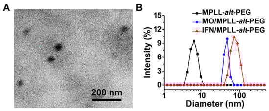 Self-assembly of MPLL-alt-PEG micelles. (A) TEM images of IFN/MPLL-alt-PEG micelles; (B) hydrodynamic diameters of free MPLL-alt-PEG, MO/MPLL-alt-PEG, and IFN/MPLL-alt-PEG micelles. IFN: recombinant human interferon α-2b; MO: methyl orange.