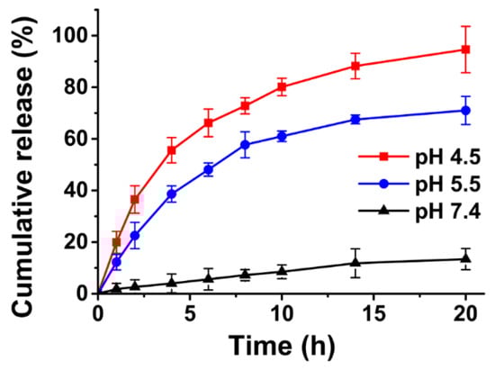 It should be mentioned that since the isoelectric point of most proteins was in the acidic range 4–6 [37], PLL-based polymers are effective for pH-responsive protein release [24]. At physiological pH, IFN molecules (isoelectric point 5.9) carrying net multiple negative charges interact electrostatically with the cationic amino termini of the MPLL segment in MPLL-alt-PEG. Once IFN-loaded micelles are transferred to an acidic microenvironment, such as infectious site [38], the charging state of IFN will be changed from net negative to net positive, while the amine side-chains of MPLL remain positively charged. Therefore, the charge switching of loaded proteins may weaken the electrostatic interactions with the MPLL-alt-PEG host, inducing accelerated drug release. As shown in Figure 4, the release rate of IFN from the copolymer at an acidic environment was much higher than that at pH 7.4, showing a pH-sensitive release behavior. The release rate of IFN was faster at pH 4.5 than that at pH 5.5, which further indicated that the disassembly process of IFN/MPLL-alt-PEG micelles was dependent on the acidity of the microenvironment. The result suggested that, in the area with more bacteria and their metabolites, antimicrobial MPLL-alt-PEG and therapeutic proteins would be easier to be recovered for more efficient treatment.