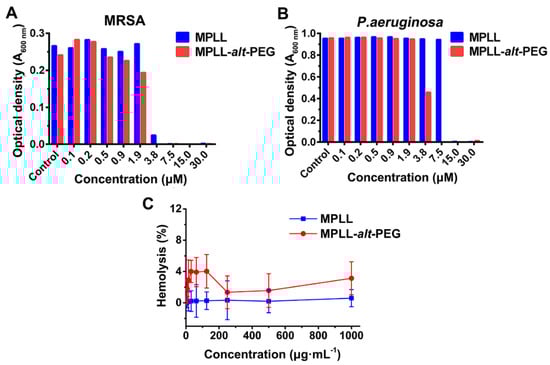 Optical density of MRSA (A) and P. aeruginosa (B) in MHB after incubation with various concentrations of MPLL and MPLL-alt-PEG copolymers for 18 h; (C) hemolysis of MPLL and MPLL-alt-PEG copolymers. MRSA: methicillin-resistant Staphylococcus aureus; MHB: Mueller Hinton Broth.