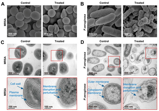 FE-SEM images of MRSA (A) and P. aeruginosa (B), and TEM images of MRSA (C) and P. aeruginosa (D) without and with MPLL-alt-PEG treatment.
