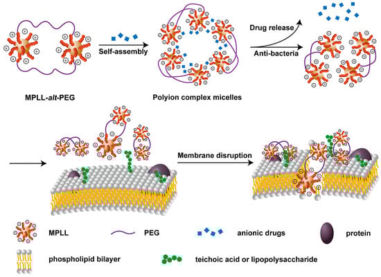 The schematic formation of drug-loaded polyion complex (PIC) micelles and their mechanism of action against bacteria through membrane disruption. MPLL: multi-armed poly(l-lysine); PEG: poly(ethylene glycol).