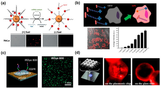 Fluorescence-based intracellular and extracellular analysis using metallic nanomaterials. (a) Au nanoparticle-quantum dots (QDs) nanoassembly for catalytic intracellular miRNA sensing with fuel DNA strands. Reproduced with permission [67]. Copyright 2015, ACS Publications. (b) “OFF-Enhanced ON” fluorescent switching system for the specific detection of miRNAs in intact cancer cells. Reproduced with permission [69]. Copyright 2018, ACS Publications. (c) Plasmonic gold chip with nanostructures for the metal enhanced fluorescence-induced immunofluorescence detection. Reproduced with permission [72]. Copyright 2016, WILEY-VCH. (d) Au plasmonic chip consisted of two-dimensional periodic structure for the enhanced fluorescence effect. Reproduced with permission [73]. Copyright 2016, ACS Publications.