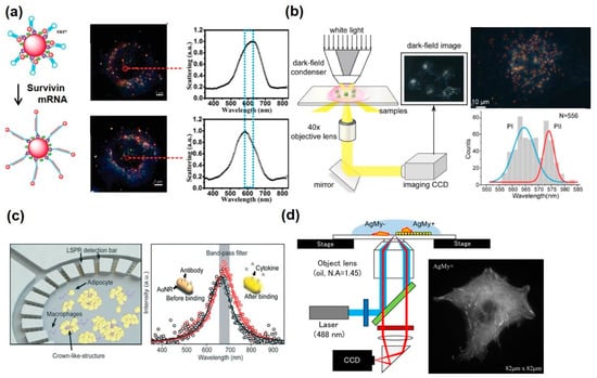 Localized surface plasmon resonance (LSPR)-based intracellular and extracellular analysis using metallic nanomaterials. (a) Survivin mRNA analysis using nanoprobes, composed of molecular beacon, small and large Au nanoparticle. Reproduced with permission [85]. Copyright 2016, Royal Society of Chemistry. (b) The high-throughput method for studying the resonance scattering light of single plasmonic nanoparticles in a dark-field image for intracellular analysis. Reproduced with permission [86]. Copyright 2015, Ivyspring International Publisher. (c) Adipose-tissue-on-chip sensing platform for an in situ multiplexed analysis of adipose tissue inflammation by changing LSPR property of the Au nanorod. Reproduced with permission [87]. Copyright 2018, Royal Society of Chemistry. (d) Cell analysis by total internal reflection fluorescence (TIRF) microscope system on Au nanosheets. Reproduced with permission [88]. Copyright 2017, PLOS.
