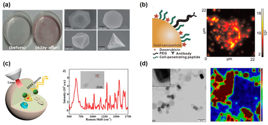 MNPs can assist with the detection of intracellular changes through the detection of specific biomolecules or ionic changes for the pH sensing by the SERS-based analysis. Zong et al. developed the intracellular pH sensor using p-aminothiophenol (pATP), a Raman reporter, functionalized hydrochloric acid (HCl)-treated Au nanorods [105]. A HCl-treated Au nanorod has the advantages of not only reduced cytotoxicity but also direct contact between the reporters and the intracellular surroundings, which could detect pH value by the interaction between pATP and Au nanorod. In the alkaline condition, pATP-functionalized Au nanorods bind to each other through the form of pATP, 4, 40-dimercaptoazobenzene (DMAB). Their conformational changes induced the alteration of the ratio of 1432 to 1076 cm−1. The intracellular pH value of HeLa cells was successfully measured, from 3 to 8 pH. Another study showed the determination of neuronal differentiation using nuclear localization signal peptides (NLS)-functionalized Au nanoparticles in a human neuroblastoma cell line using SERS analysis [106]. The neural progenitor cells have different biological properties such as the DNA/RNA ratio and protein expression levels, comparing differentiated cells. The authors succeeded to distinguish between the Raman spectrum of differentiated cells and progenitor cells using the principal component analysis for whole cell scans. Though there were some analytical processes for the principal component analysis, it could segregate undifferentiated from differentiated cells with a simple endocytosis method of Au nanoparticles. MNP-based SERS signals have also been measured in living cells. One study exhibited the formation of the MNPs inside the living cells with diverse shapes such as circle, triangle, and square, and they were detected by the SERS analytical method [107] (Figure 3a). The result demonstrated that treatment of different cell lines with metal ions resulted in forming the different shapes of MNP due to the reduction of metal ions in the living cells. In addition, formed Au nanoparticles in the living cells exhibited enhanced Raman spectra with a large-wavelength laser, which could minimize fluorescence interference and photo-toxicity. Another study showed in situ monitoring of releasing drug from the nanoparticles inside the cells using SERS-based analysis [108] (Figure 3b). Au nanoparticles were utilized as the intracellular delivery cargo with doxorubicin, cell-penetrating peptide, and anti-HER2 antibody. After the endocytosis of Au nanoparticle to the HER2-positive cancer cells (SK-BR-3), doxorubicin was released due to the intracellular glutathione. According to the SERS results, 90.23% of the doxorubicin was released within 24 h of particle treatment. Zeng et al. developed graphene oxide-coated Au nanoparticles without adding any surfactant, which caused low efficiency of the SERS signal, and it applied to the intracellular drug delivery with doxorubicin [109] (Figure 3c). The graphene oxide-coated Au nanoparticle showed excellent SERS signal because graphene oxide also enhanced Raman signal by chemical enhancement and was used as biocompatible nanoprobes for intracellular biosensing and doxorubicin delivery with π–π interaction between graphene oxide and doxorubicin. For the enhancement of SERS intensity, gold and Au were used as a core-shell nanoparticle formation labeled with Raman probe, para-mercaptobenzoic acid (4MBA) molecules [110]. This bimetallic core-shell nanostructure showed the presence of two interacting LSPR modes and high SERS activity. For the no anti-proliferative effects, chitosan was coated on the core-shell nanoparticles and it could be used to measure the intracellular pH through the measurement of SERS signal, from pH 4.3 to 7.5. Ziang et al. applied zeolitic imidazolate framework (ZIF-8) as a coating agent to the gold-Au core-shell nanoparticles for the enhancement of SERS intensity [111] (Figure 3d). This nanoparticle could also be loaded with doxorubicin and targeting moiety (folic acid) for cancer treatment and intracellular imaging. The resulting nanoparticles possess a strong SERS effect, high drug loading capacity, and excellent biocompatibility. In addition, it was used as optical and Raman imaging simultaneously and cancer treatment by doxorubicin. Otherwise, several MNPs could enhance the SERS signal from the intracellular region for the effective analysis of biological alteration.