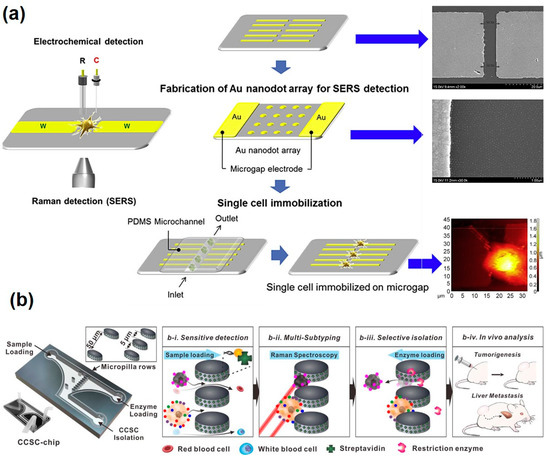 In addition to the intracellular analysis using the SERS-based analytical method, there have been extracellular analytical platforms integrated with metal nanostructures on analytical chips to allow in situ monitoring of the live cells. Neural stem cell differentiation was determined using three-dimensional graphene oxide-encapsulated gold nanoparticles by SERS signal measurement [112]. The graphene oxide-encapsulated gold nanoparticles were deposited on the chip surface, and the neural stem cells were maintained and differentiated. Undifferentiated cells had high numbers of C=C bonds; on the other hand, differentiated neuronal cells exhibited low numbers of C=C bonds due to the saturated cell membranes. Using this phenomenon, Raman shift can be measured with different intensities of the specific peaks (around 1656 cm−1) between undifferentiated and differentiated neuronal cells. In addition, electrochemical analysis was conducted simultaneously using the redox property of the neural stem cells. In result, graphene oxide-encapsulated gold nanoparticles combined with SERS and electrochemical techniques were successfully monitored through stem cell differentiation. Moreover, an Au nanodot array with Au microgap electrode was developed for single cell analysis using SERS and linear sweep voltammetry (LSV) analysis simultaneously [113] (Figure 4a). This combined platform could measure the intracellular and extracellular redox state of PC12 cells, which is dopaminergic cell, available for both bulk and single PC12 cell. It is expected that this spectroelectrochemical cell chip platform can be a very powerful in situ tool for monitoring intracellular and extracellular changes with multi and single cell level regarding their redox environment. The breast cancer cell using Ag nanostar modified ITO substrates were also characterized. [114]. Compared with an Au nanopattern modified ITO substrate, Raman signals from the Ag nanostar modified ITO substrate showed significantly increased signals. Using this Ag nanostar platform, SK-BR-3 and MCF-7 breast cancer cells were determined to different Raman peaks. The dominant peaks of the MCF-7 were at 1030, 1060, and 852 cm−1, and SK-BR-3 showed significant peaks at 1377 and 1490 cm−1. Au nanopatterned ITO substrate was also utilized for the distinguishing of breast cancer subtype by using SERS analysis [115]. Two different breast cancer cell lines (MDA-MB-231 and MCF-7) were determined by the measurement of chemical components such as nucleic acids, fatty acids, chemical bonds, etc. Raman spectrum by SERS analysis of the MDA-MB-231 and MCF-7 exhibited different shapes and peaks so the classification of the cells could be relatively easy with the nondestructive method by measurement of Raman spectrum. Noninvasive analysis of the circulating cancer stem cells (CCSCs) was successfully conducted with microfluidic chips and Raman reporter-labelled Au nanoparticles [116] (Figure 4b). Solution-based analyte with several cells was flown into the cell and micropillars separated circulating cells and other small biomolecules. Raman reporter-labelled Au nanoparticles were selectively bound to the CCSC surface and it could confirm the subtyping of specific cells, which was characterized by the surface marker such as HER2, CD133, EGFR, EpCAM, and MUC-1. In addition, separated cells could be isolated by the loading of restrict enzyme with opposite flow for the detachment of CCSC on the micropillar. CCSCs were detected (90% efficiency), and selectively isolated CCSCs (93% accuracy) were employed for both in vitro and in vivo tumor phenotyping to identify the tumorigenicity of the CCSCs.