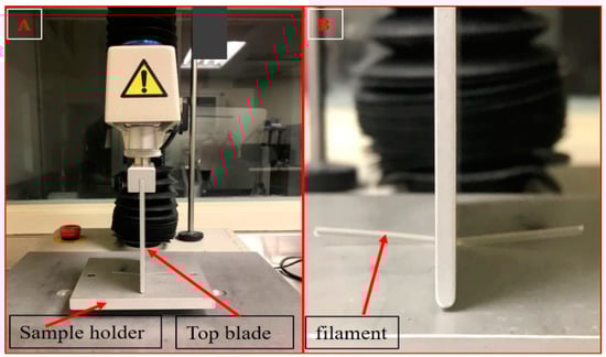 Texture analyzer set up (A) and stiffness test of the extruded filaments (B).