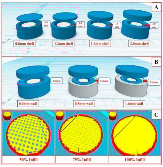 To assess the effect of the wall thickness and infill density of shell on the pulse release of drug, tablets with three different wall thicknesses (0.0, 0.8, and 1.6 mm) and three infill densities were studied (50%, 75%, and 100%). The tablets with higher wall thicknesses prevented the entry of the dissolution media more effectively than those with low wall thicknesses. This is attributed to the closed, compact structure of the wall. This observation was consistent with the results of a previous study [34]. The tablets with 100% infill densities demonstrated pulse release at the end of 4.5 ± 0.26 h, followed by 75% infill (2 ± 0.22 h), and 50% infill (0.5 ± 0.19) (Figure 7C). The higher porosity of lower infill density has a higher surface area and allows easy entry of the dissolution media into the core, resulted in a faster release of API. Yang et al. [35] and Chen et al. [36], who used FDM 3D printing for the development of controlled release dosage forms, reported that a higher fill density caused a reduction in the total surface area and resulted in slower drug release from the dosage forms.