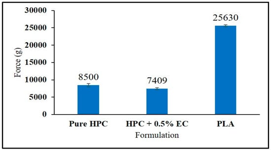 Even though PLA is considered as a reference material for comparing the mechanical properties of the filaments in 3D printing, it is interesting to note that filaments with a lower stiffness (breaking stress and force) than the PLA filament were good enough for the FDM 3D printing process. This may be due to a variation in the force applied by the gears of the different 3D printers during feeding of the filaments into the 3D printer. In this study (Figure 3), the force required to create a 35% deformation in the shape of the filament was considered as the maximum force that the filaments could withhold during the feeding process without any breaking or squeezing phenomenon in the feeder. Pure HPC and HPC + EC require a lower force of 8500 g and 7409 g, respectively, as compared to that of the reference material PLA (25,630 g). However, these filaments did not show any breaking or squeezing problems during the printing process, which resulted in the fabrication of high-quality floating tablets.