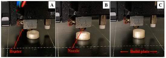 During the HME process, the filaments exiting the extruder die were coiled in irregular shapes and were difficult to process through the 3D printer. Therefore, a conveyor belt was used to straighten the filaments for easy loading into the 3D printer. After solidification, the filaments were coiled and stored in a desiccator to prevent moisture uptake. The filaments that absorbed moisture became soft and squeezed between the feeding gears of the 3D printer. This is because, after moisture absorption, the flexibility of the filaments increased, preventing the melted material from pushing through the heater. Further, the inflow of materials from the printer nozzle was irregular.