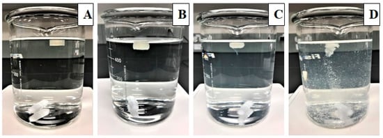 Images of the floating tablets taken at different time points during the dissolution study in 0.1 N HCl: 0 h (A), 2 h (B), 4 h (C), and 6 h (D).
