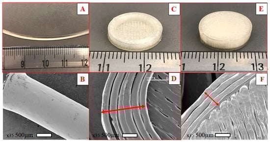 Digital images and representative SEM images of the hot-melt extrusion (HME) filament (A,B), the cross-sectional structure of the floating tablet showing shell (C,D), and surface morphology of a 100% infill 3D printed tablet (E,F).