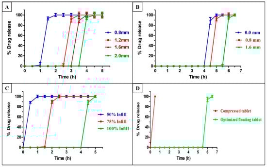 In vitro release profiles of the floating tablets with different shell thicknesses in 0.1 N HCl (A), different wall thicknesses (B), different fill densities (C), and optimized floating tablets and compressed tablets (D). Error bars represent mean ± S.D.