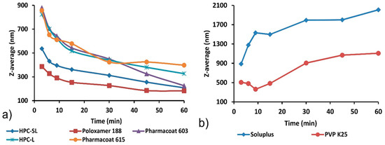 Glimepiride particle size vs. time profiles recorded during wet media milling with different stabilizers. (a) HPC-SL, HPC-L, Poloxamer 188, Pharmacoat® 603 and Pharmacoat® 615; (b) Soluplus® and PVP K25. Polymers have been grouped according to Z-average diameter scale, for clarity.