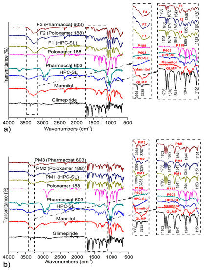 FT-IR spectra of: (a) Raw materials, spray dried nanosuspensions (F1–F3) and (b) corresponding physical mixtures (PM1–PM3). GLMP stands for Glimepiride, P603 for Pharmacoat® 603, and P188 for poloxamer 188.