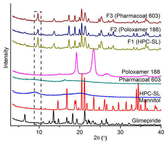 All polymers used as stabilizers of nanosuspensions showed only broad endothermic events in the DSC curves, which are characteristic for amorphous materials (data not shown). The melting peak of glimepiride was observed in all samples of the spray dried nanosuspensions, confirming the presence of crystalline glimepiride. A significant shift of glimepiride’s melting peak from 214.4 °C to 187.6–188.4 °C was observed in the thermograms of spray dried nanosuspensions. It is well known that melting point depression occurs with reduction in the size of crystals, as described by the Gibbs–Thomson equation [47]. Additionally, mannitol as the major component of the mixture melts at lower temperatures and mixing of glimepiride with the molten mannitol also contributes to melting point depression phenomena. DSC analysis of physical mixtures of equivalent composition with the spray dried nanosuspensions also showed shifting of melting peak of glimepiride. However, in the case of spray dried nanosuspensions, glimepiride’s melting peak reduction was 5–6 °C lower, suggesting that this effect is a consequence of both crystal size reduction and mixing of glimepiride with molten mannitol.