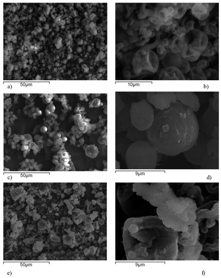 Scanning electron micrographs of spray dried nanosuspensions are shown on Figure 9. Spray dried particles of nanosuspensions stabilized with HPC-SL and Pharmacoat® 603 showed characteristic wrinkled-surface sphere morphology. During spray drying of droplets, spherical particles are initially forming a thin solid coat during drying of the droplet surface, under which the liquid droplet interior is still preserved. Progression of drying process causes elevation of pressure within the sphere due to water evaporation from interior droplet, which leads to the collapse of the sphere and formation of particles with hollow surfaces [53]. Spherical agglomerates were observed in the micrographs of spray dried nanosuspension stabilized with poloxamer 188, attributed to the partial melting of poloxamer in the stream of hot air during the spray drying process. This hinders redispersion of nanoparticles upon contact with aqueous medium, as proven by the results of redispersibility testing, probably due to a thick gel later formation. A close-up look at the particle surface (Figure 9b,d,f) revealed the presence of individual nanoparticles embedded within the mannitol matrix.