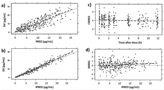 GOF plots obtained for the final model: (a) population predictions (PRED) and (b) individual predictions (IPRED) against observed linezolid plasma concentrations (DV, µg/mL), (c) conditional weighted residuals (CWRES) versus time after dose (h), and (d) the individual weighted residuals (IWRES) versus individual concentration predictions (µg/mL).