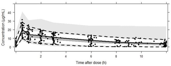 Results from the VPC from 0 to 12 h after dose. Dots correspond to the observed concentrations (µg/mL). The continuous line represents the median, while the dashed lines correspond to the 2.5th and 97.5th observed percentiles. Simulation-based 95% CIs for the median and both 2.5th and 97.5th percentiles are displayed by dark-gray and light-gray shading, respectively.