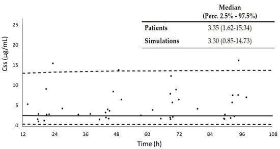 Figure 3 shows the comparison of the concentrations at steady-state (Css) observed in the 11 patients used for validation, which received linezolid by continuous infusion, and the median value and 2.5% and 97.5% percentiles obtained by simulation, using the final model. As can be appreciated, our model was able to predict patients’ concentrations properly.