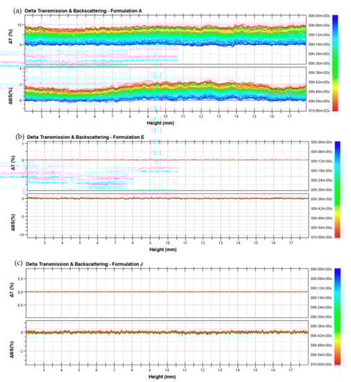 Delta back scattering (ΔBS) and delta transmission (ΔT) profiles of (a) formulation A, (b) formulation E, and (c) formulation J. Panels report representative experiments of five independent experiments. Data are reported as a function of time (0–1 h) and sample height.