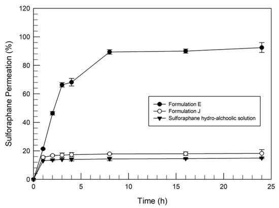 The previously described results allowed the formulations with the best physico-chemical features and the most suitable stability profiles with and without sulforaphane to be selected. The ability of E and J formulations to release the drug was also investigated by using dynamic skin permeation systems, by determining the amount of released sulforaphane as a function of time. As shown in Figure 3, formulation E released ~67% of the entrapped drug during 24 h. The release profile of sulforaphane from formulation E was characterized by a biphasic trend. That is, the amount of sulforaphane entrapped in the outer surface bilayer was quickly released during the first five hours. After this initial rapid release, sulforaphane was gradually and steadily released over time, probably depending on the chemical characteristics of sulforaphane, which allowed a certain affinity with the vesicular structure. On the other hand, the sulforaphane release profile of transfersomes® (Formulation J) was significantly lower (p value < 0.005) than the release from formulation E. In detail, this result was less than 10%. This poor release was probably due to the great affinity of sulforaphane to the chemical components (phospholipids and sodium cholate) of the transfersomes®, as already demonstrated by Celia et al. [24] for linoleic acid-loaded transfersomes®.