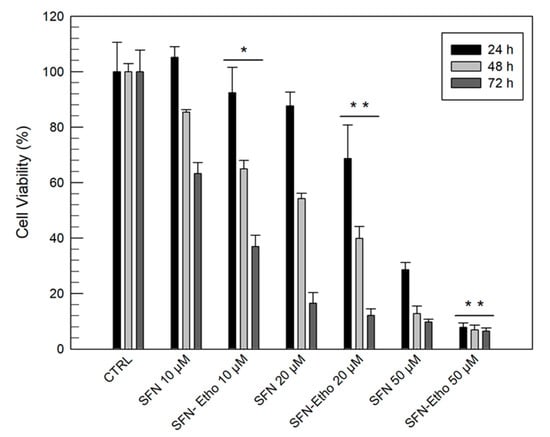 In vitro cytotoxicity of free sulforaphane (SFN) and sulforaphane-loaded Formulation E (SFN-Etho) on SK-MEL 28 melanoma cells as a function of the drug concentration and incubation time. The results were normalized as a function of the blank formulation E cytotoxicity. Results are the mean of three different experiments ± standard deviation. The data obtained for SFN-Etho are statistically significant with respect to the same concentration of free SFN (* p < 0.05; ** p < 0.001).