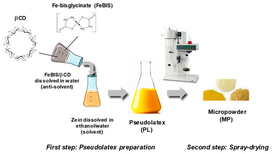 The strategy proposed here consists in processing the hydrophobic plant-based protein zein with the cyclic oligosaccharide βCD and overall aimed to obtain a powder formulation delivering micronutrients. Processing of powders was attempted with a two-step method with the potential of industrial scale-up, where a zein-based pseudolatex incorporating the bioactive component is then processed by spray-drying giving a final solid product with controlled-release features. As a model compound, we selected FeBIS, which is the iron source with the highest oral bioavailability. It is employed in different patient population suffering anaemia (about 25% of the global population) and the fact that there is a rising demand for side-effects free iron supplement products.
