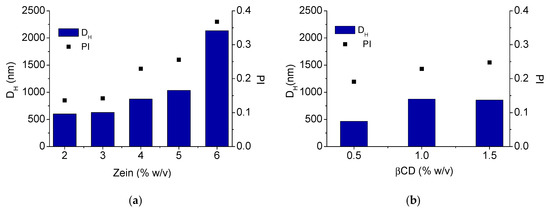 In the first part of the study, we investigated the impact of zein concentration and βCD addition on pseudolatex hydrodynamic diameter (DH) and polydispersity (PI) (Figure 2). In the formulation approach, the concentration of βCD in water was maintained constant at 1% w/v while zein concentration was gradually increased. As illustrated in Figure 2a, DH and PI increased proportionally as the concentration of zein in the hydroalcoholic solution did. No macroscopic aggregation was also observed at large particle size and high PI. At each zein concentration tested, the addition of βCD 1% w/v in the aqueous phase did not impact significantly on the final size and PI (data not shown).