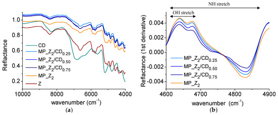 NIR spectra of zein and zein/CD micropowders. Reflectance (a) and first derivative spectra in the interval 4600–4900 cm−1 (b).
