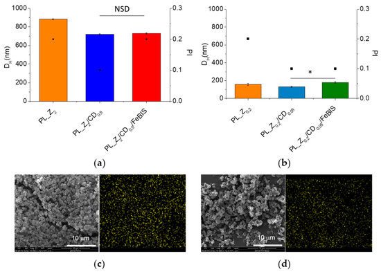 DH (bars) and PI (squares) of the pseudolatex employed to prepare powders at FeBIS theoretical loading of 2% (a) and 8% w/w (b). SEM images and corresponding energy dispersive X-ray (EDX) mapping of iron (yellow) in the MP_Z2/CD0.5/FeBIS (c) and MP_Z0.2/CD0.05/FeBIS (d). NSD: no significant difference. * p < 0.02.