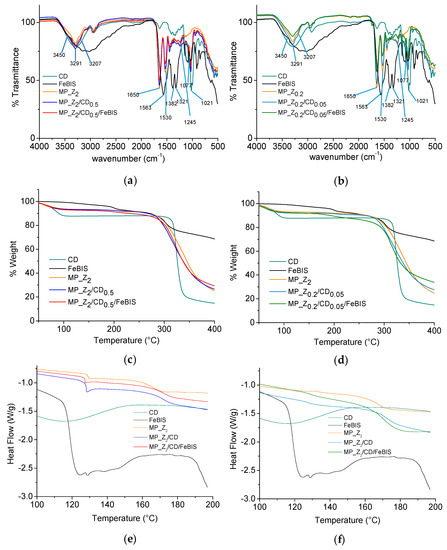 The thermogravimetric analysis (TGA) of micropowders at different FeBIS loading and corresponding unloaded micropowders, βCD and FeBIS was carried out to monitor the mass loss of the products at an increasing temperature from 40 to 400 °C (Figure 5c,d). TGA for raw zein is reported in supplementary material, Figure S3. The micropowder composition did not significantly affect curve trends. It is worth to notice, however, an incipit of degradation at around 150 °C in the case of MP_Z0.2/CD0.05/FeBIS, which loads the highest amount of FeBIS. The water content, which corresponds to the initial weight loss until around 100 °C, was found to be the same for all the samples (below 10%).
