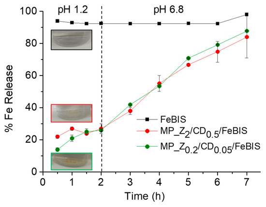 The release of FeBIS was studied in simulated gastric fluid (SGF) pH 1.2 and simulated intestinal fluid (SIF) pH 6.8, both supplemented with enzymes. As shown in Figure 6, the micropowders loaded with different amount of FeBIS released an amount of total iron (Fe2+/Fe3+) below 30% after 2 h in SGF while free FeBIS was immediately dissolved, as expected for a water-soluble compound. When the medium was changed to SIF, the iron release occurred at a sustained and constant rate, reaching 80% in 7 h.