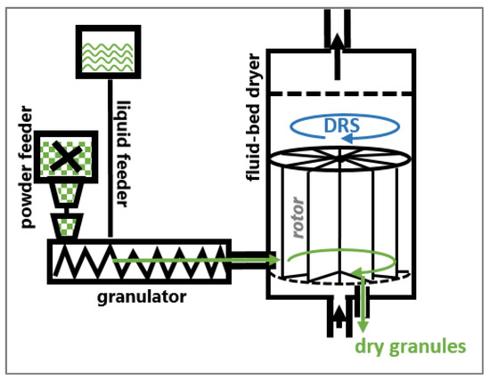Drying was conducted at 80 °C drying temperature, 140 m3/h drying airflow and 17 rph dryer rotation speed, unless stated otherwise. Dried granules are discharged from the dryer outlet by compressed air (2 bar) through two alternating discharge valves. Before starting the drying process, the dryer is pre-heated 1.5 h ± 5 min at the intended drying temperature and an airflow of 140 m3/h. An overview of the investigated CM line is shown in Figure 1.