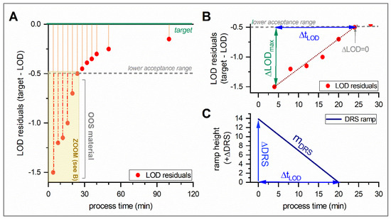In Figure 2, a detailed description on ramp height (ΔDRS) and slope (mDRS) calculation is presented. Figure 2A plots the LOD residuals, calculated from “target—observed LOD” (arbitrary example data set); where residuals <−0.5%LOD indicate OOS (overdried) material, since target ± 0.5% LOD define the acceptance range. In Figure 2B, the OOS section from A is shown in detail, indicating the maximum OOS result (ΔLODmax; calculated from lowest observed LOD, LODlow and lower acceptance range, according to Equation (2) and the time it takes for the LOD deviation to reach the lower acceptance range (ΔtLOD).