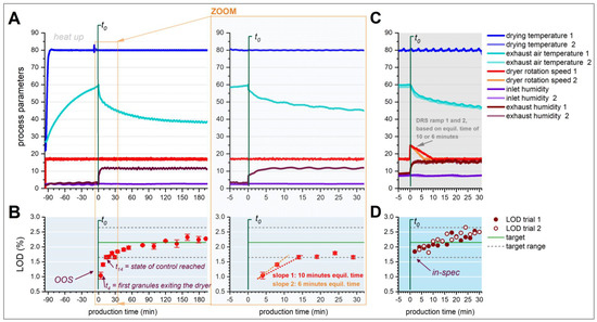 (A) Process dynamics in the continuous fluid-bed dryer during heat up and after starting the drying process at t0. The right side of A shows a zoom-in sections of the left graph. (B) LOD-dynamics during process start-up after 1.5 h of FBD pre-heating (t0 = start of granulation). Acceptance limits are defined as dry-blend LOD (=target LOD) ± 0.5%. (C) Process dynamics in the continuous fluid-bed dryer after starting the drying process with the model-based DRS start-up procedure. (D) LOD-dynamics during process start-up with DRS start-up-procedure; LOD is found within its acceptance range from the very beginning. Figure adapted from [29].