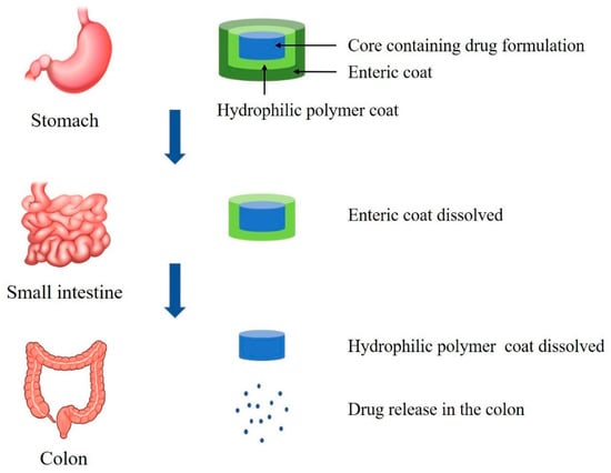 For the local treatment of colonic diseases, colon-targeted drug delivery systems have been actively pursued since conventional non-targeted therapy may have undesirable side-effects and low efficacy due to the systemic absorption of drug before reaching the target site [4,5]. In addition to the topical delivery, colon-targeted drug delivery systems are also applicable to improve the bioavailability of drugs vulnerable to acidic and/or enzymatic destabilization in the upper gastrointestinal (GI) tract, particularly macromolecules such as proteins and peptides due to lower protease activity in the colon [6,7,8]. Although colonic delivery of macromolecules has been explored less extensively compared to small molecules, continuous research may reveal its potential as an effective oral delivery system for macromolecules.
