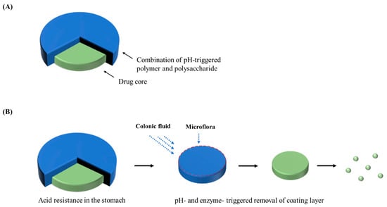 Ibekwe et al. [20] reported a novel colonic coating technology which integrated pH-dependent and bacterially-triggered systems into a single layer matrix film. Tablets were film-coated by using a mixture of Eudragit S and biodegradable polysaccharide. Gamma scintigraphy study in human volunteers confirmed the consistent disintegration of these tablets in the colon regardless of feeding status, suggesting that this dual-mechanism coating may overcome the limitation of single trigger systems and improve the colonic drug targeting [20]. Subsequently, Phloral® (Figure 2) coating technology demonstrated the precise and fail-safe drug release in the colon in both healthy and diseased states [81]. This system consists of an enzyme-sensitive component (natural polysaccharide) and a pH-dependent polymer, where these pH and enzymatic triggers work in a complementary manner to facilitate site-specific release [81]. Even if the dissolution threshold of the pH-dependent polymer is not reached, the enzyme-sensitive component is independently digested by enzymes secreted by colonic microflora. This additional fail-safe mechanism overcomes the limitations of conventional pH-dependent systems. This innovative technology has been validated in clinical studies for consistent drug release with reduced-intra subject variability in patients and healthy subjects [81,82]. It is also applicable for the oral delivery of macromolecules such as peptides, proteins, and vaccines. Recently, Dodoo et al. [83] investigated the applicability of this technology in the colonic delivery of probiotics. The commercial products as well as in-house freeze-dried Lactobacillus acidophilus strain were encapsulated into capsules using dual-trigger coating technology to target the delivery into lower small intestines or colon. The viabilities of approximately 90% were retained after these capsules were exposed to gastric environment for 2 h while the unencapsulated probiotics showed poor tolerance to the gastric environment [83]. Based on a comparative cohort analysis in patients, Allegretti et al. [84] also demonstrated the effective colon-targeting of the fecal microbiota transplantation capsules coated with a blend of enzyme-triggered and pH-responsive polymers.