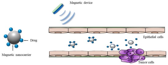 Schematic illustration of magnetic nanocarrier drug delivery system.