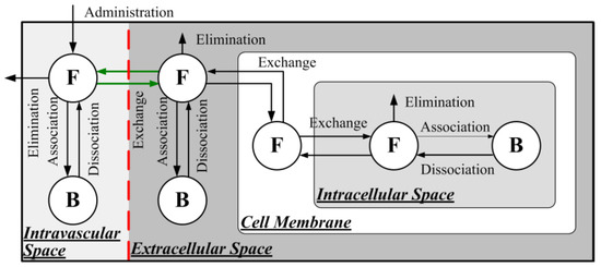 Two assumptions are further involved at this point: (I) the dynamic equilibrium of free doxorubicin concentration can be achieved in different tissue compartments [24] (; ) and (II) the concentration of bound drug is linearly related to that of the drug in its free from [20] (; ). Equation (6) can thus be rewritten as