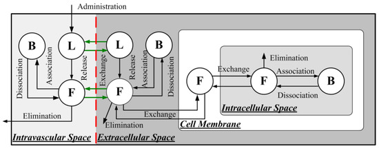 The intravascular concentration of free doxorubicin () is determined by the transvascular exchange between IVS and tissue ECS, drug release from liposomes, binding with proteins and plasma clearance.