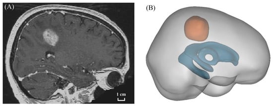 The 3D geometrical model of a brain tumour and surrounding normal tissue was reconstructed from anonymous MR images, which were acquired in three orthogonal planes. These images were stored on the image database TCIA, and are available for scientific purposes under a Creative Commons Attribution 3.0 Unported License [25,26]. Each image slice was 1 mm thick, and comprised 256 × 256 pixels. The dimension of each pixel was also 1 mm. Figure 3A shows a representative image slice as used in this study.