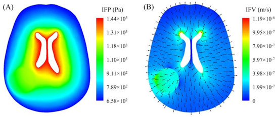 As the drug convective and diffusive transport in tissue ECS are both dependent on the interstitial fluid, its flow field was expected to play an important role in determining the delivery outcomes. In this study, the interstitial fluid flow was predicted by solving the governing Equations (1)–(3) throughout the entire brain, subject to the biological properties and the boundary conditions described above.