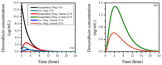 A close look at the doxorubicin concentration in normal tissue is given in Figure 5B, where the drug presented similar trends as in the tumour ECS. However, the concentrations were about three orders of magnitude lower. This is because the drug reached the normal tissue from the tumour by convective and diffusive transport.