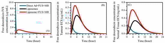 The time course of free doxorubicin concentration under different delivery modes. (A) IVS, (B) tumour ECS and (C) normal tissue ECS.