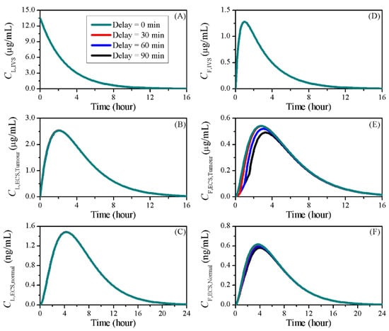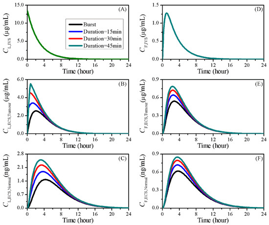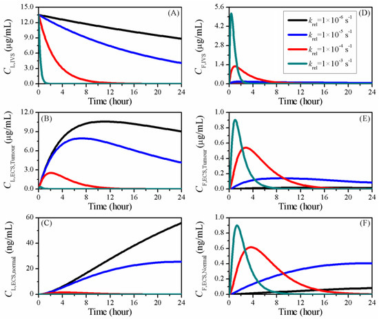The time courses of doxorubicin concentration in treatments using liposomes with different release rates. Liposome-encapsulated doxorubicin in (A) IVS, (B) tumour and (C) normal tissue ECS; free doxorubicin in (D) IVS, (E) tumour and (F) normal tissue ECS.
